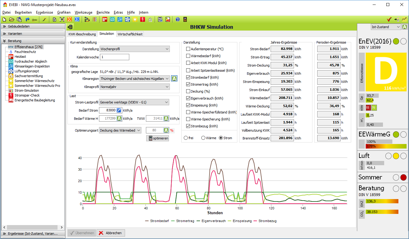 Entscheidend für die Rentabilität eines BHKW ist die möglichst gleichzeitige Erzeugung und Abnahme von Wärme und Strom. Daher ist eine Simulation des Betriebs mit den passenden Profilen sinnvoll. Die BHKW Simulation erfüllt alle Anforderungen an eine sachgerechte Planung.