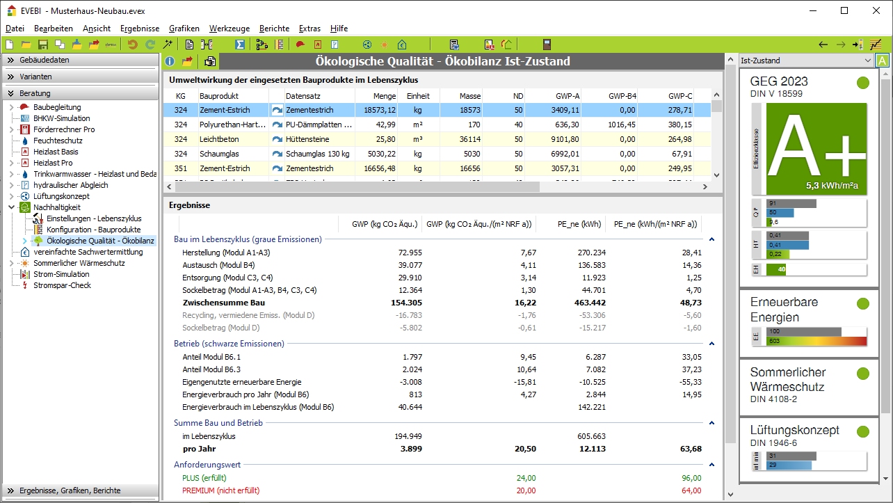 Die Ökobilanz-Software ermöglicht die Berechnung der Umweltwirkungen eines Gebäudes gemäß den Berechnungsvorschriften des QNG (Qualitätssiegel Nachhaltiges Gebäude).