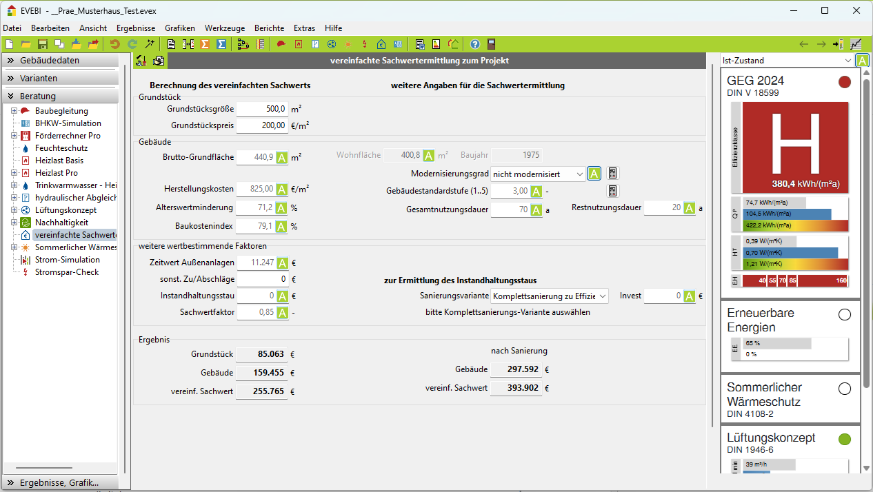 Das Modul ermöglicht eine Sachwertermittlung von Wohngebäuden auf der Grundlage des Baujahres, der Größe, des Ausstattungsstandards, des Standortes und der Grundstücksgröße. Wird eine Sanierungsvariante vorgeschlagen, so wird zusätzlich der Sachwert für dieses Gebäude nach Sanierung ermittelt.