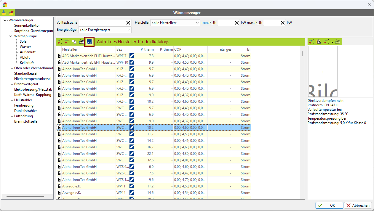 - Übernahme weiterer Herstellerdaten direkt aus dem Internet in die Datenbank Wärmeerzeuger von EVEBI