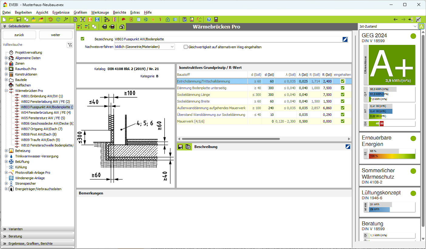 - Die Bedingungen zur Einhaltung der Wärmebrücken werden angezeigt und können mit den realen Wärmebrücken bzw. Planungsunterlagen abgeglichen werden.