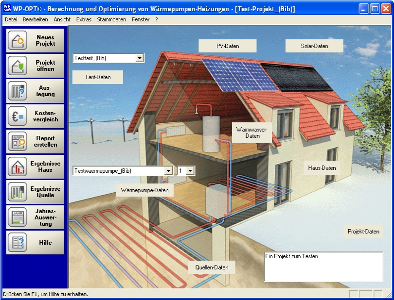Technische Parameter der Wärmepumpen, Quellentemperaturen und Temperaturanforderungen der Heizung beeinflussen sich gegenseitig, so dass es schwierig ist, ohne eine Computersimulation Prognosen über das Betriebsverhalten und die Wirtschaftlichkeit der gesamten Heizungsanlage zu erhalten. Mit WP-OPT© können Wärmepumpenheizungen praxisorientiert geplant und optimiert werden.